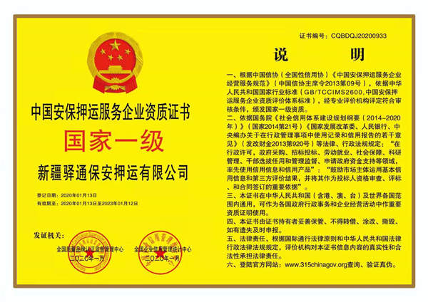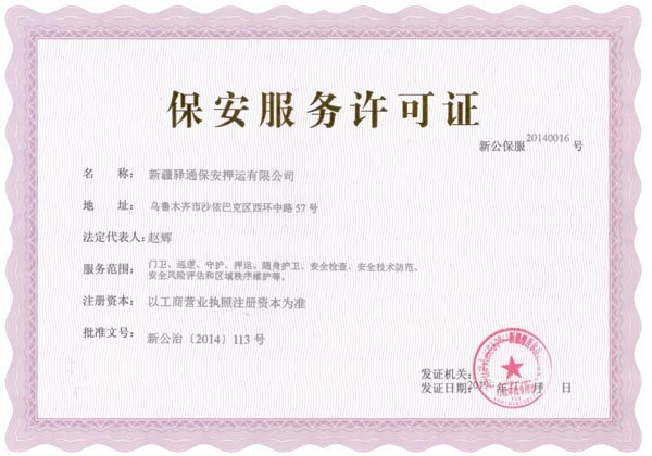 新疆驛通保安押運(yùn)有限公司,注冊(cè)資本1000萬元人民幣,具有獨(dú)立法人資格,下設(shè)部門有:綜合管理辦公室、人力資源部、指揮中心、保衛(wèi)部、財(cái)務(wù)部、業(yè)務(wù)部、押運(yùn)部、督察隊(duì)、公司金庫。公司建立了符合市場(chǎng)和現(xiàn)代企業(yè)要求的經(jīng)營運(yùn)作模式和管理機(jī)制,有一套較科學(xué)的經(jīng)營管理制度、守押勤務(wù)制度、守押作業(yè)規(guī)范化操作制度和標(biāo)準(zhǔn)。